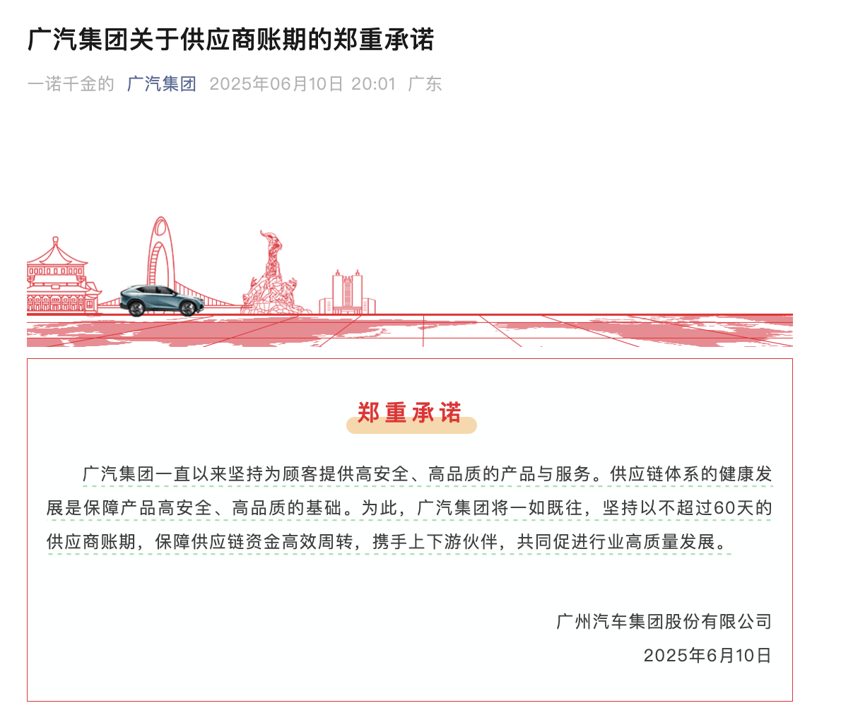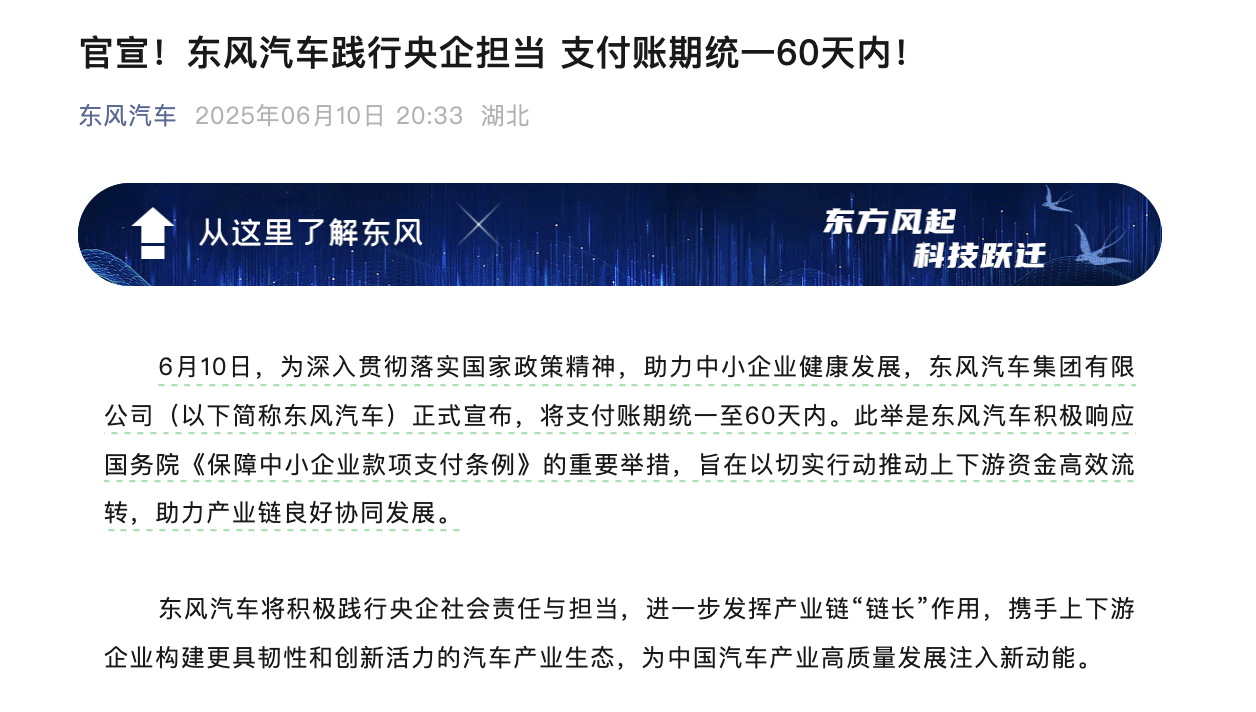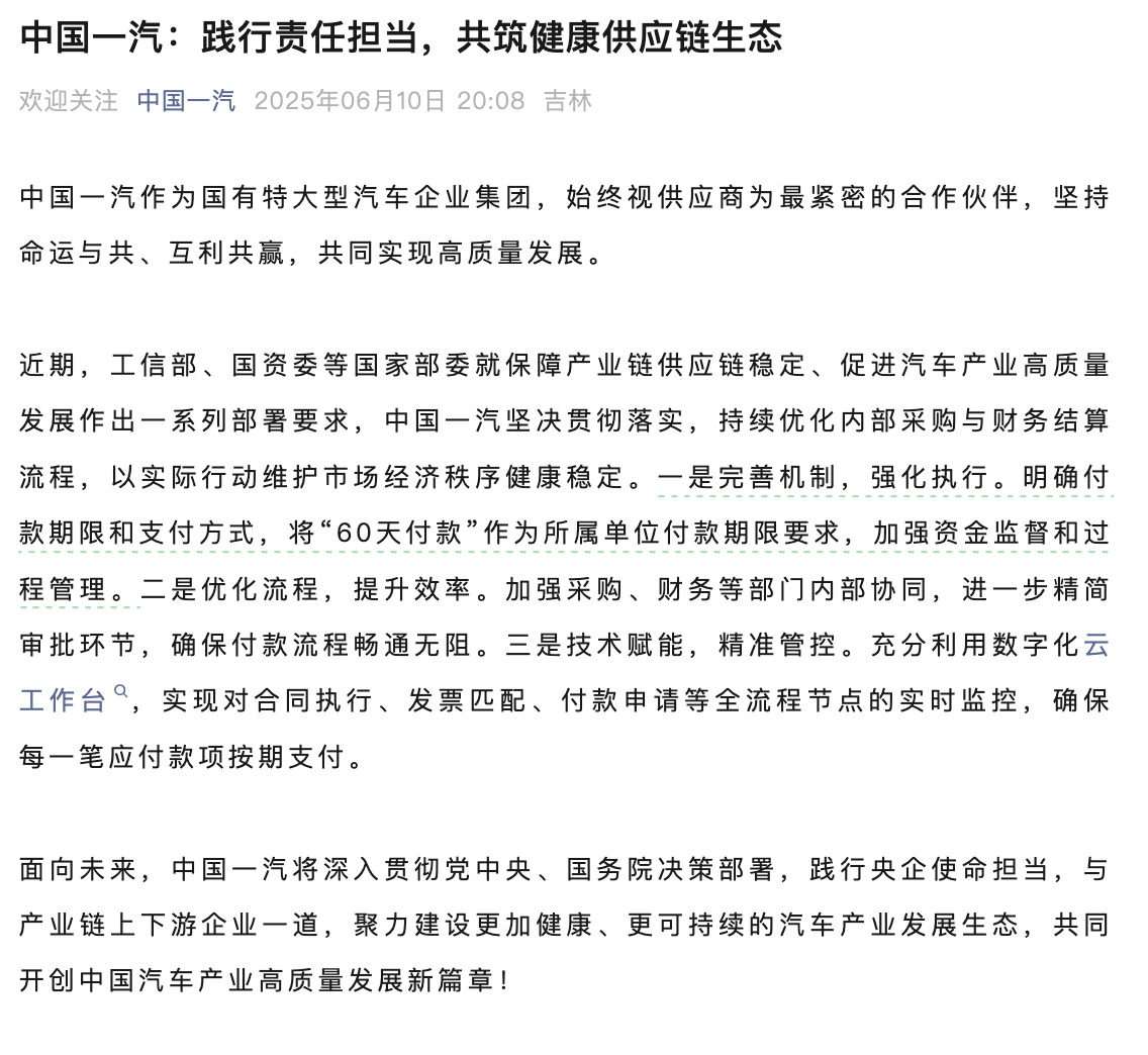 6月10日晚間,中國第一汽車集團有限公司、東風(fēng)汽車集團有限公司、廣州汽車集團股份有限公司、賽力斯集團股份有限公司率先做出承諾將供應(yīng)商支付賬期統(tǒng)一嚴(yán)格限定在60天以內(nèi)。隨后吉利汽車集團有限公司、重慶長安汽車股份有限公司、比亞迪股份有限公司、奇瑞汽車股份有限公司、小鵬汽車有限公司等車企跟進。這不僅是響應(yīng)《條例》的強制要求,更是行業(yè)領(lǐng)軍者挺身而出,以實際行動抵制惡性競爭、修復(fù)產(chǎn)業(yè)生態(tài)的反內(nèi)卷宣言。