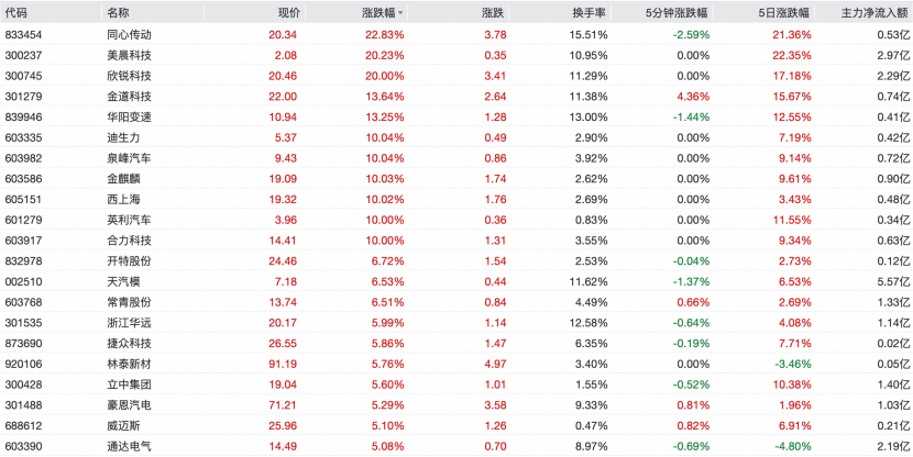 6月11日,汽車零部件板塊開盤多股飆漲。截至記者發(fā)稿,同心傳動(證券代碼:833454.BJ)漲22.83%,美晨科技(證券代碼:300237.SZ)、欣銳科技(證券代碼:300745.SZ)20cm漲停,金道科技(證券代碼:3001279.SZ)、華陽變速(證券代碼:839946.BJ)、迪生力(證券代碼:603335.SH)等多只個股漲逾10%。