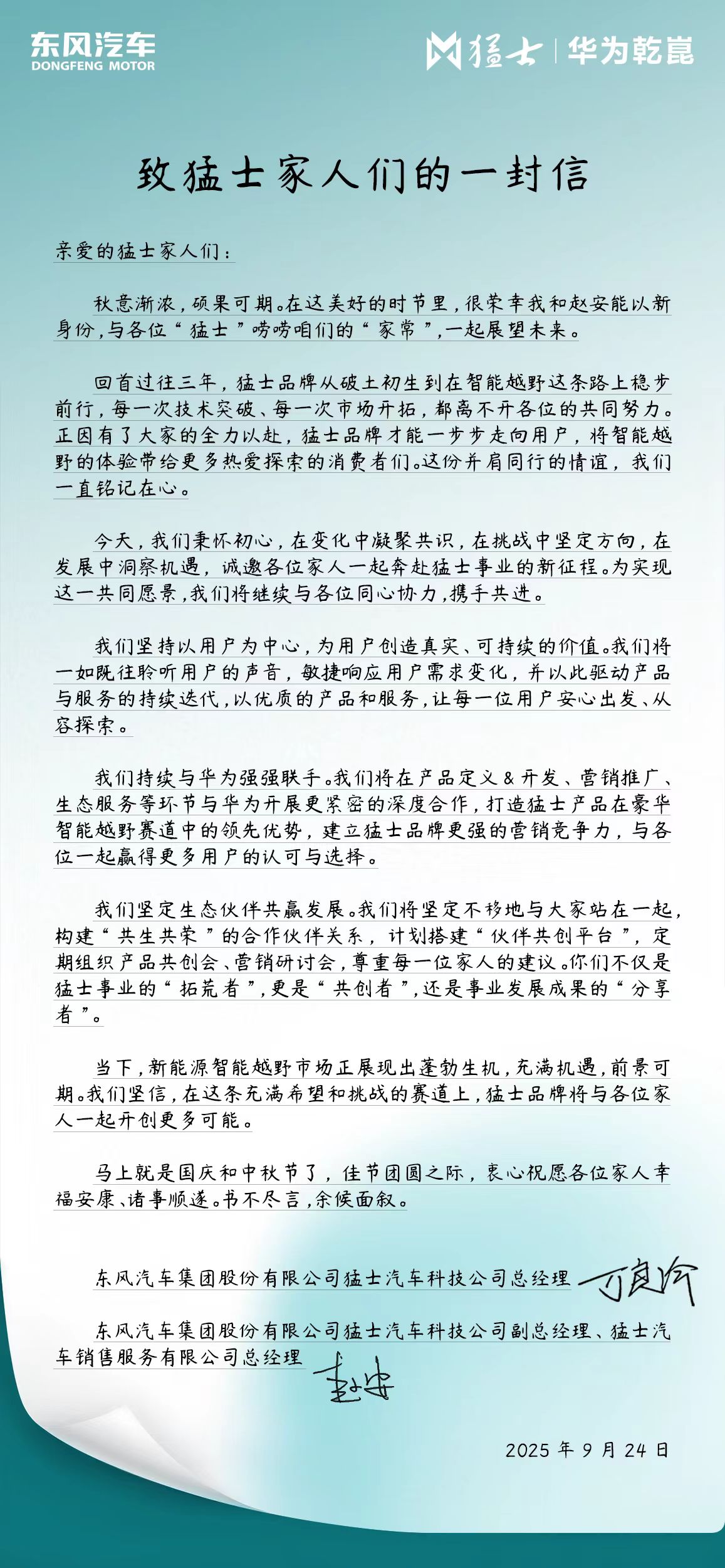 “我們將在產(chǎn)品定義和開發(fā)、營銷推廣、生態(tài)服務(wù)等環(huán)節(jié)與華為開展更緊密的深度合作,打造猛士產(chǎn)品在豪華智能越野賽道中的領(lǐng)先優(yōu)勢,建立猛士品牌更強的營銷競爭力。”這封家書,正將這份戰(zhàn)略合作的構(gòu)想,推向新的高度。