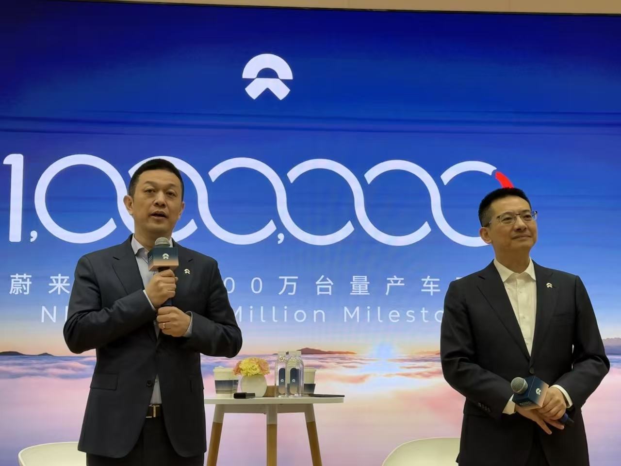 蔚來創(chuàng)始人、董事長、CEO李斌,蔚來聯(lián)合創(chuàng)始人(左)、總裁秦力洪(右)在第100萬臺量產(chǎn)車下線媒體溝通會上與媒體對話(劉釗/攝影)