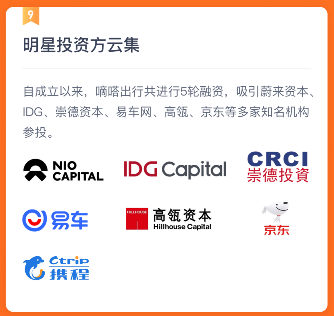 作為中國(guó)第二大順風(fēng)車(chē)平臺(tái),嘀嗒出行擁有豪華股東陣容,吸引多家知名投資機(jī)構(gòu)和企業(yè)參投,包括蔚來(lái)資本、IDG、CRCI、易車(chē)網(wǎng)、高瓴、京東及攜程等。