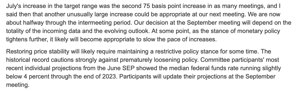 鮑威爾的鷹派發(fā)聲是7月末美聯(lián)儲(chǔ)議息會(huì)議以來(lái)首次公開(kāi)講話。7月份,美聯(lián)儲(chǔ)再次加息75個(gè)基點(diǎn),將聯(lián)邦基金利率提升至2.25%至2.5%區(qū)間,已處于市場(chǎng)廣泛認(rèn)同的“中性利率”水平。而鮑威爾在會(huì)議中再次透露出繼續(xù)激進(jìn)加息的信號(hào)。他在發(fā)言中稱,“7月份進(jìn)行第二次75個(gè)基點(diǎn)加息時(shí)我就曾說(shuō)過(guò),在下次會(huì)議進(jìn)行非常規(guī)幅度的加息也并非不合適……歷史經(jīng)驗(yàn)告誡我們,不要過(guò)早放松政策。”