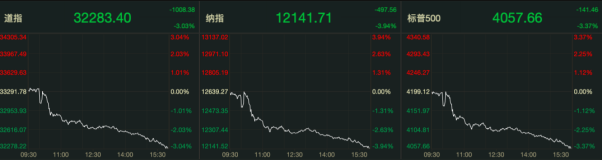 而美股則集體跳水,道瓊斯工業(yè)指數(shù)跌超1000點(diǎn),報(bào)收32283.40點(diǎn),跌幅3.03%;納斯達(dá)克指數(shù)跌近500點(diǎn),報(bào)收12141.71點(diǎn),跌幅3.94%;標(biāo)普500指數(shù)報(bào)收4057.66點(diǎn),跌3.37%。