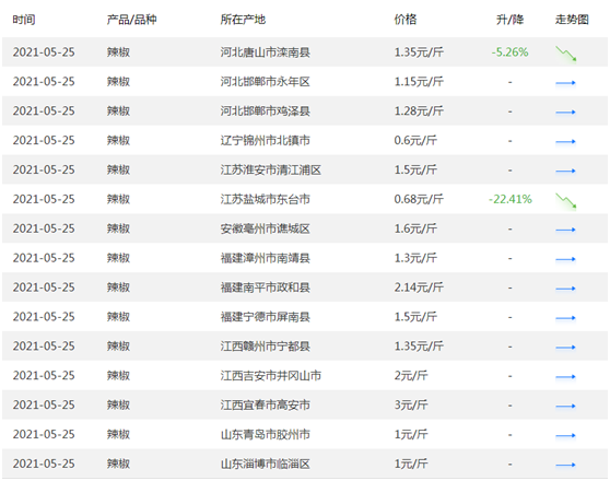 在豬肉價格下跌的同時,辣椒價格也迎來了一輪快速跳水?;蒉r(nóng)網(wǎng)大數(shù)據(jù)顯示,5月25日,河北、遼寧、江蘇、安徽、福建、江西、山東等多地的辣椒現(xiàn)貨價格已經(jīng)跌至1元/斤至2元/斤的區(qū)間內(nèi)。其中,江蘇鹽城的辣椒現(xiàn)貨受新貨上市影響,一度大跌22.41%,批發(fā)價格跌到0.68元/斤。