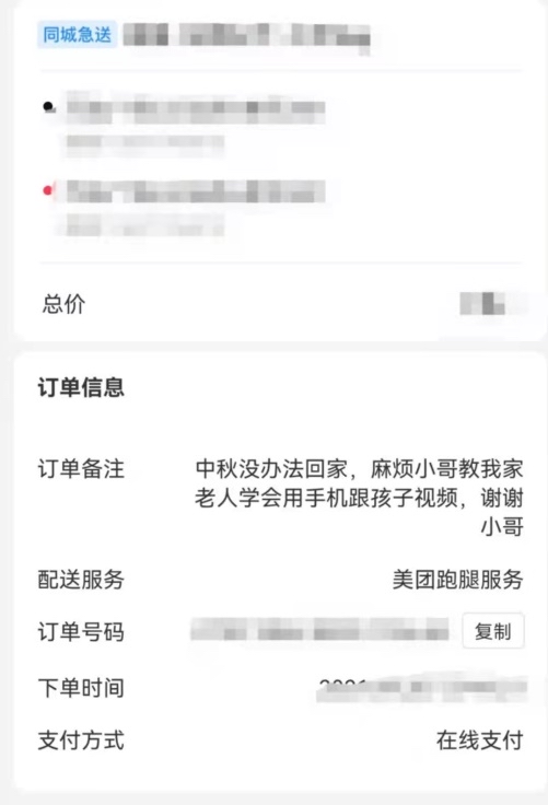 美團(tuán)跑腿數(shù)據(jù)顯示,在跑腿訂單中有不少是請(qǐng)小哥幫助家中老人的內(nèi)容,最常見的訂單包括“上門調(diào)試電信網(wǎng)絡(luò)電視節(jié)目、教會(huì)老人開機(jī)選節(jié)目,謝謝”、“在樓下扶老人上樓謝謝”、“給老人取熬制好的中藥一袋,請(qǐng)跑腿帥哥注意行車安全!”、“麻煩幫助老人使用智能手機(jī),懂得怎么操作視頻通話就可以”……這些各種各樣的跑腿訂單里,滿滿都是愛意。
