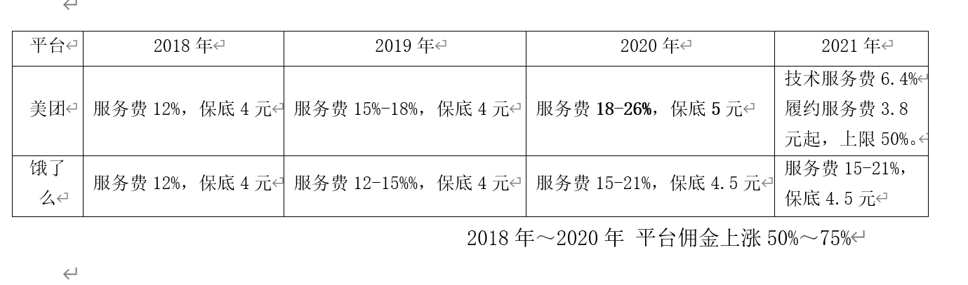 事實(shí)上,面對(duì)餐飲行業(yè)出現(xiàn)的負(fù)增長(zhǎng)及從業(yè)人員的呼吁,2021年,美團(tuán)、餓了么等平臺(tái)開始進(jìn)行費(fèi)率改革。