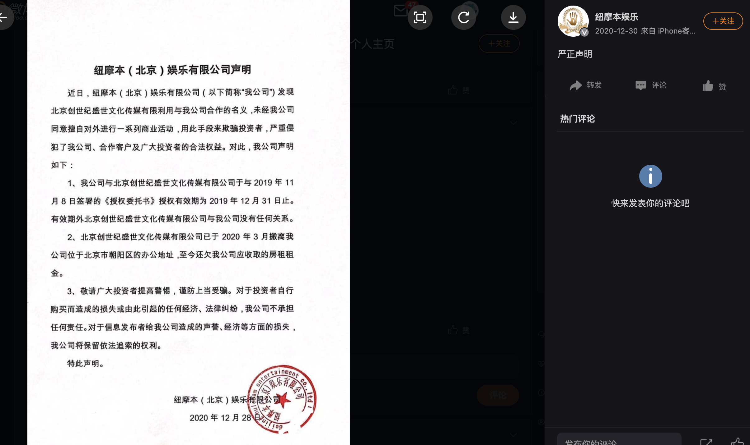 令人意外的是,2020年12月28日,紐摩本官方微博曾發(fā)布聲明稱:我公司2019年11月8日與創(chuàng)世紀(jì)簽署的《授權(quán)委托書》授權(quán)有效期為2019年12月31日止,有效期外創(chuàng)世紀(jì)與紐摩本沒有任何關(guān)系。