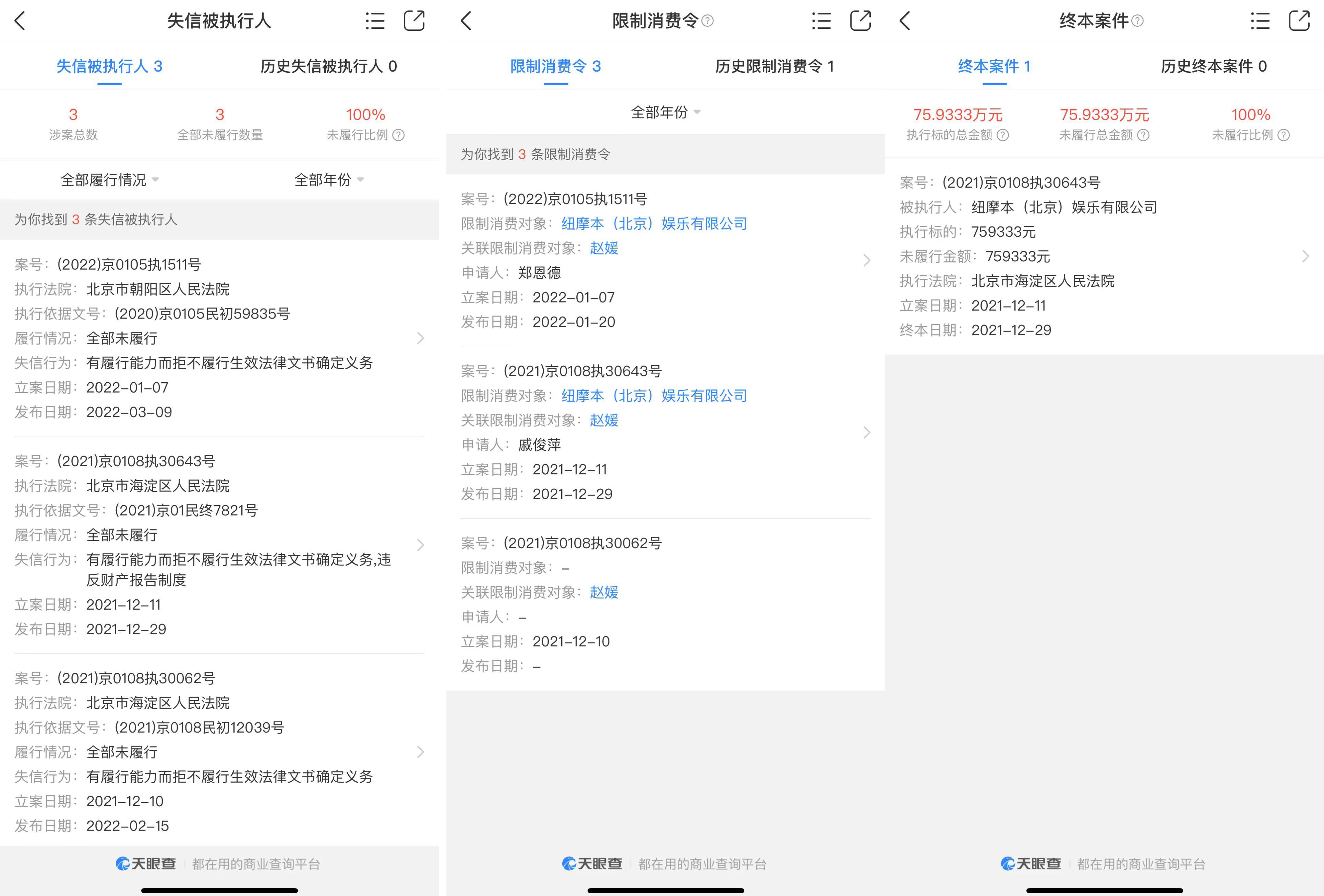 天眼查App顯示,創(chuàng)世紀(jì)涉及法律訴訟7起,七成以上是合同糾紛,其中6起處于一審狀態(tài)。而紐摩本涉及法律訴訟17起,其中11起處于一審狀態(tài),均為合同糾紛,2021年12月1日紐摩本已被列為限制高消費(fèi)企業(yè),同月被列為失信執(zhí)行人。當(dāng)前,紐摩本被執(zhí)行總金額85.52萬元,終本案件1起,被執(zhí)行總金額75.93萬元,法人趙媛也被“限高”。