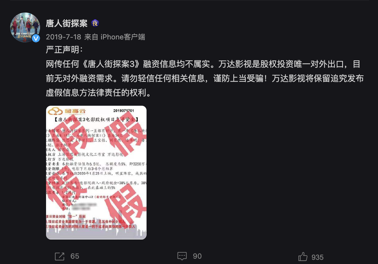 早在2019年7月份,《唐人街探案》官方微博就公開表示:“網(wǎng)傳任何《唐探3》融資信息均不屬實(shí)。萬達(dá)影視是股權(quán)投資唯一對(duì)外出口,目前無對(duì)外融資需求。”