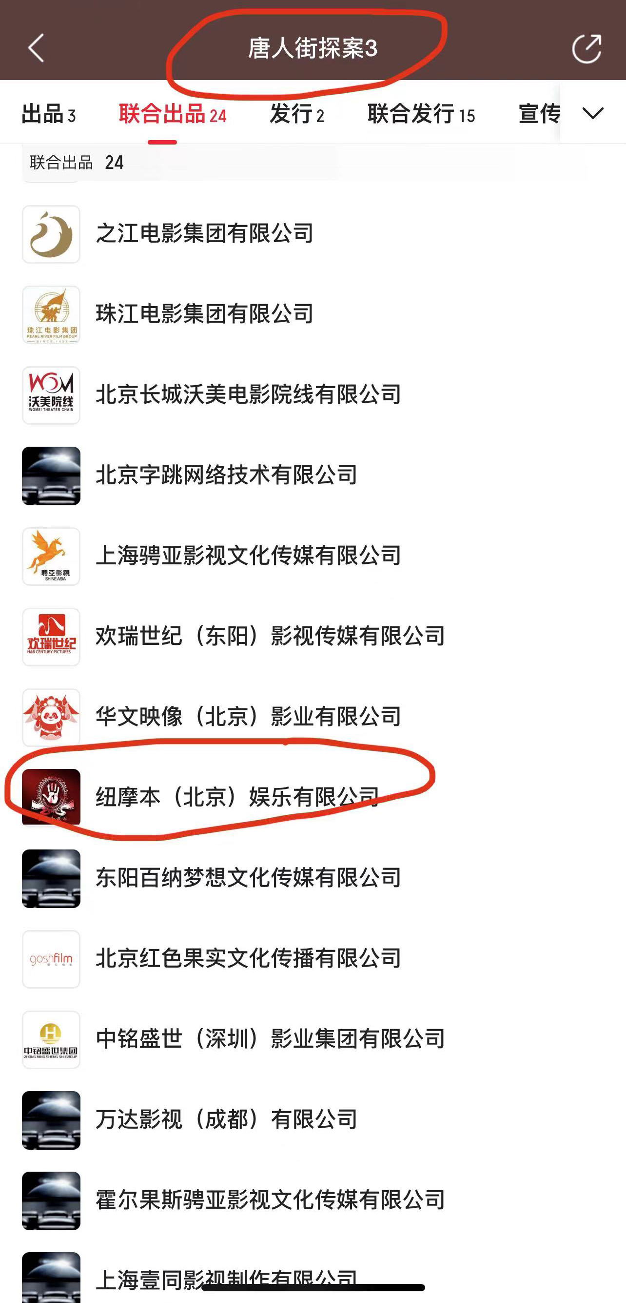 據(jù)多位投資者轉(zhuǎn)述,馬鉑倫曾表示,紐摩本的投資份額來自萬達(dá)電影(萬達(dá)影視母公司)。貓眼信息顯示,《唐探3》有24家聯(lián)合出品方,紐摩本是其中之一。因此,投資者對(duì)馬鉑倫的說法深信不疑。