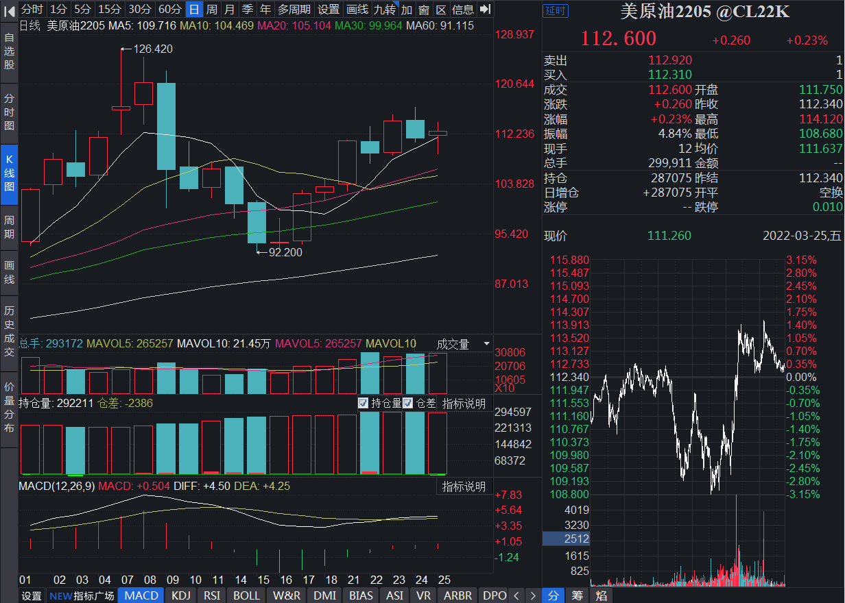 本周(3月21日至3月25日),國際油價結(jié)束了連續(xù)兩周的下跌行情,實現(xiàn)上漲。截至3月25日收盤,5月份交貨的NYMEXWTI原油期貨期間累計上漲9.02%,收于112.60美元/桶;5月份交貨的布倫特原油期貨期間累計上漲10.89%,收于119.98美元/桶;上期所原油期貨主力合約本周也累計上漲了7.21%,收于734.5元/噸。