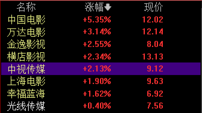 《阿凡達(dá)2》定檔后,相關(guān)話題立刻登上熱搜榜前列,資本市場(chǎng)亦反應(yīng)強(qiáng)烈。11月23日,多只影視股盤(pán)中快速拉升。截至當(dāng)日收盤(pán),中國(guó)電影漲5.35%,萬(wàn)達(dá)電影漲3.14%,上海電影漲1.9%,金逸影視漲2.55%,橫店影視漲2.34%。