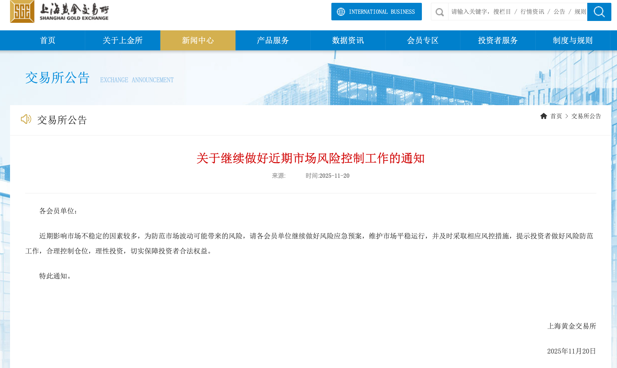 11月20日,上海黃金交易所發(fā)布《關(guān)于繼續(xù)做好近期市場風(fēng)險(xiǎn)控制工作的通知》(以下簡稱《通知》)?!锻ㄖ繁硎?,近期影響市場不穩(wěn)定的因素較多,為防范市場波動(dòng)可能帶來的風(fēng)險(xiǎn),請各會員單位繼續(xù)做好風(fēng)險(xiǎn)應(yīng)急預(yù)案,維護(hù)市場平穩(wěn)運(yùn)行,并及時(shí)采取相應(yīng)風(fēng)控措施,提示投資者做好風(fēng)險(xiǎn)防范工作,合理控制倉位,理性投資,切實(shí)保障投資者合法權(quán)益。