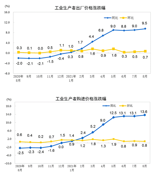 2021年8月份,全國工業(yè)生產(chǎn)者出廠價格同比上漲9.5%,創(chuàng)下2008年9月以來新高。環(huán)比上漲0.7%;工業(yè)生產(chǎn)者購進(jìn)價格同比上漲13.6%,環(huán)比上漲0.8%。1月份至8月份平均,工業(yè)生產(chǎn)者出廠價格比去年同期上漲6.2%,工業(yè)生產(chǎn)者購進(jìn)價格上漲8.6%。