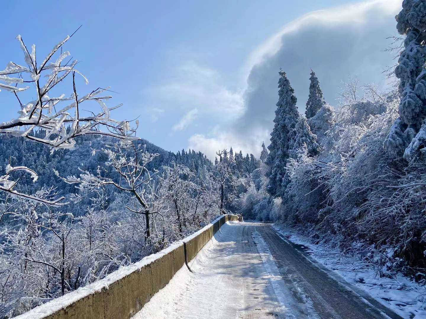 在山區(qū)公路上看到遠(yuǎn)處的降雪宛如仙境(攝影:肖偉)