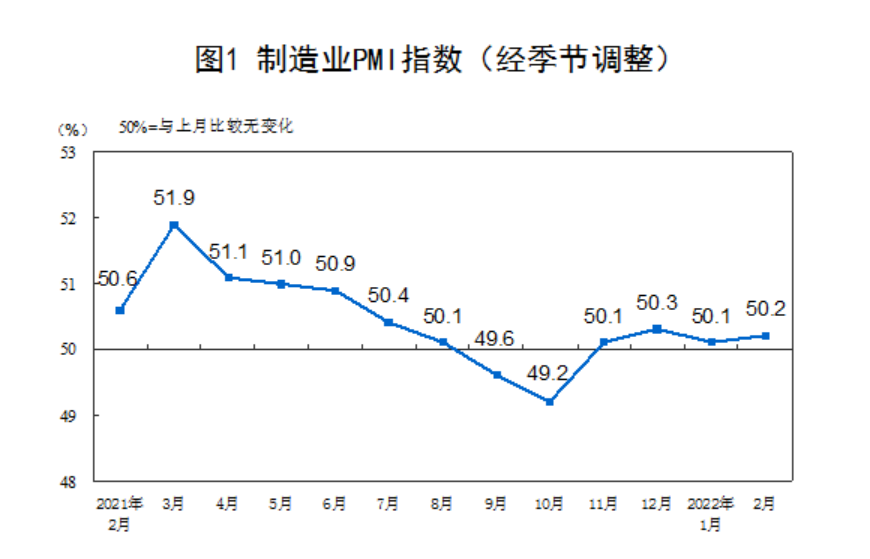 據(jù)國家統(tǒng)計(jì)局3月1日消息,2月份,中國制造業(yè)采購經(jīng)理指數(shù)(PMI)為50.2%,比上月上升0.1個(gè)百分點(diǎn),繼續(xù)高于臨界點(diǎn),制造業(yè)景氣水平略有上升。