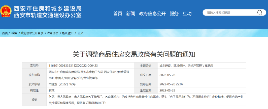 5月28日22時,西安市住房和城鄉(xiāng)建設(shè)局官方網(wǎng)站公開了共有“四大類九條舉措”的《關(guān)于調(diào)整商品住房交易政策有關(guān)問題的通知》(以下簡稱《通知》)。