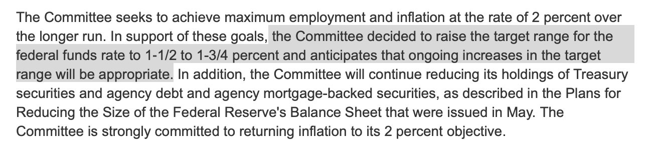 另外,聲明中還顯示,委員會(huì)將繼續(xù)減少其持有的國債和機(jī)構(gòu)債務(wù)以及抵押貸款支持證券(MBS),正如5月份發(fā)布的《減少美聯(lián)儲(chǔ)資產(chǎn)負(fù)債表規(guī)模的計(jì)劃》中所描述的一樣。委員會(huì)堅(jiān)定地致力于將通貨膨脹率恢復(fù)到2%的目標(biāo)。