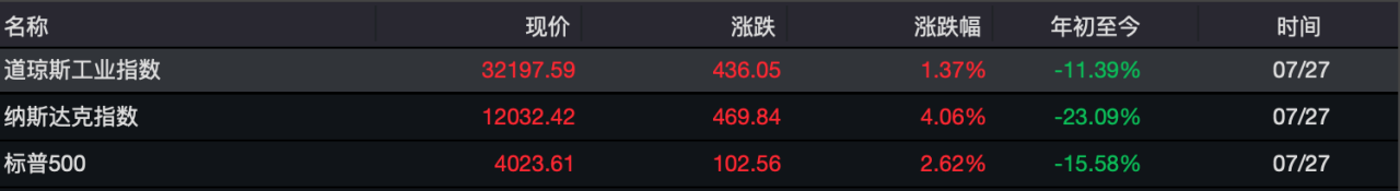 此次加息落地后,美股尾盤出現(xiàn)較大拉升。截至當?shù)貢r間7月27日收盤,道瓊斯指數(shù)收報32197.59點,上漲1.37%;納斯達克指數(shù)收報12032.42點,上漲4.06%;標普500指數(shù)收報4023.61點,上漲2.62%。但多位分析人士表示,對后續(xù)美股走勢仍持謹慎態(tài)度。