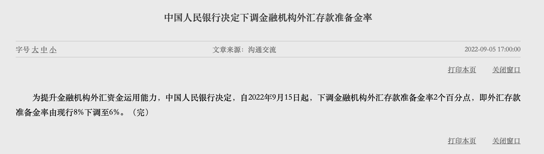 為提升金融機(jī)構(gòu)外匯資金運(yùn)用能力,中國(guó)人民銀行決定,自2022年9月15日起,下調(diào)金融機(jī)構(gòu)外匯存款準(zhǔn)備金率2個(gè)百分點(diǎn),即外匯存款準(zhǔn)備金率由現(xiàn)行8%下調(diào)至6%。