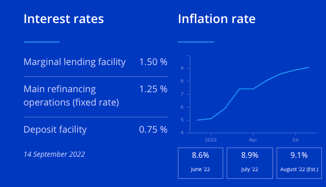 7月份,歐洲央行已進(jìn)行50個基點的加息,結(jié)束了主要存款利率過去8年一直為負(fù)的局面,此次9月份加息75個基點也是其歷史上最大的加息幅度。