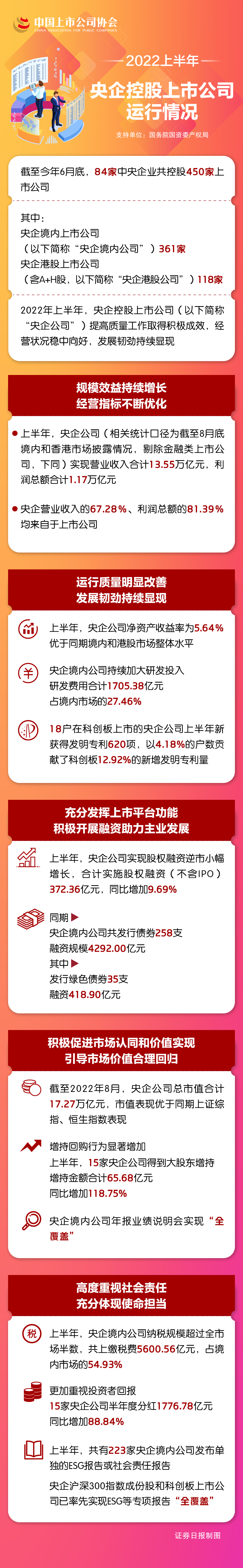 五是高度重視社會責(zé)任,充分體現(xiàn)使命擔(dān)當(dāng)。上半年,央企境內(nèi)公司納稅規(guī)模超過全市場半數(shù),共上繳稅費(fèi)5600.56億元,占境內(nèi)市場的54.93%。同時(shí),央企公司更加重視投資者回報(bào),15家央企公司實(shí)施半年度分紅,分紅總額1776.78億元,同比增加88.84%。此外,央企公司積極貫徹新發(fā)展理念,ESG實(shí)踐走在市場前列。上半年,共有223家央企境內(nèi)公司發(fā)布單獨(dú)的ESG(環(huán)境、社會和公司治理)報(bào)告或社會責(zé)任報(bào)告,在國務(wù)院國資委的倡導(dǎo)下,央企滬深300指數(shù)成份股和科創(chuàng)板上市公司已率先實(shí)現(xiàn)ESG等專項(xiàng)報(bào)告“全覆蓋”。