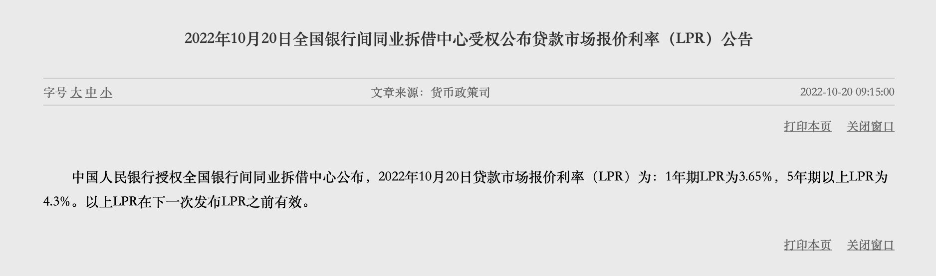 10月20日,最新一期市場報(bào)價(jià)利率(LPR)出爐。中國人民銀行授權(quán)全國銀行間同業(yè)拆借中心公布:1年期LPR為3.65%,5年期以上LPR為4.3%。