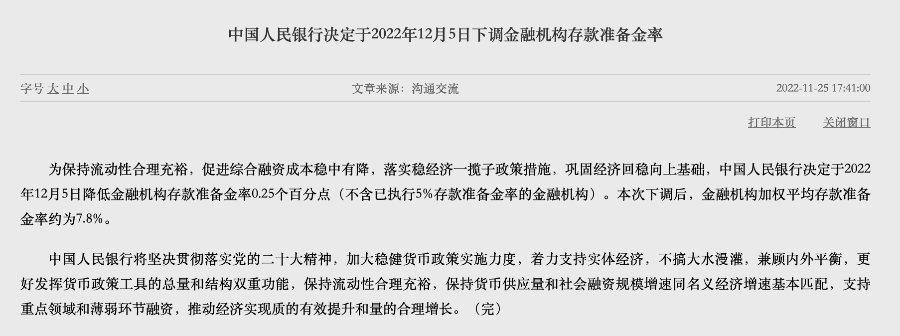 11月25日,中國人民銀行發(fā)布消息,為保持流動性合理充裕,促進(jìn)綜合融資成本穩(wěn)中有降,落實穩(wěn)經(jīng)濟(jì)一攬子政策措施,鞏固經(jīng)濟(jì)回穩(wěn)向上基礎(chǔ),中國人民銀行決定于2022年12月5日降低金融機(jī)構(gòu)存款準(zhǔn)備金率0.25個百分點(不含已執(zhí)行5%存款準(zhǔn)備金率的金融機(jī)構(gòu))。本次下調(diào)后,金融機(jī)構(gòu)加權(quán)平均存款準(zhǔn)備金率約為7.8%。