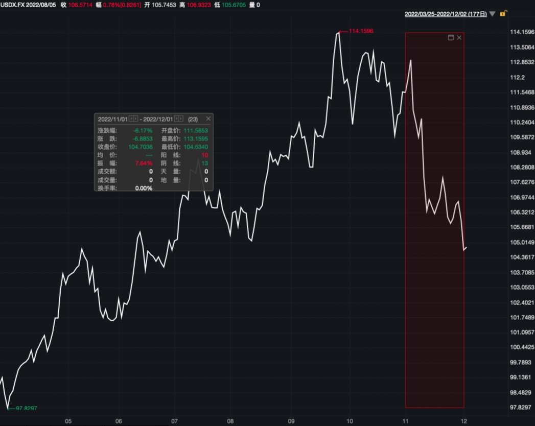 12月1日歐洲交易時(shí)段盤中,美元指數(shù)快速回落至105關(guān)口下方,跌幅一度超1%,盤中最低下探至104.5607,創(chuàng)今年6月末以來新低。Wind數(shù)據(jù)顯示,11月1日至12月1日,美元指數(shù)已累計(jì)下跌約6.17%。截至12月2日記者發(fā)稿,美元指數(shù)報(bào)104.8071,仍處于105下方,較9月27日創(chuàng)下的年內(nèi)最高點(diǎn)114.4777,已回落約8.4%。