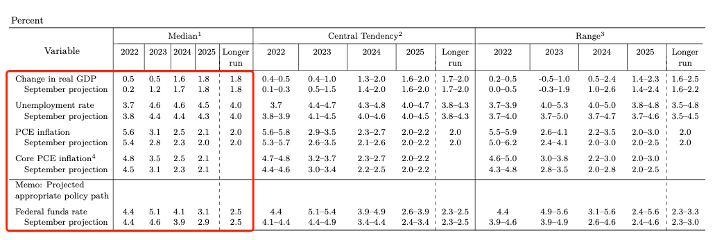 在本次的FOMC會(huì)議上,美聯(lián)儲(chǔ)還發(fā)布了最新的經(jīng)濟(jì)預(yù)測(cè),再次大幅下調(diào)了經(jīng)濟(jì)增長(zhǎng)預(yù)期。同時(shí),美聯(lián)儲(chǔ)官員利率預(yù)測(cè)的“點(diǎn)陣圖”也調(diào)高了2023年至2025年終端利率水平。