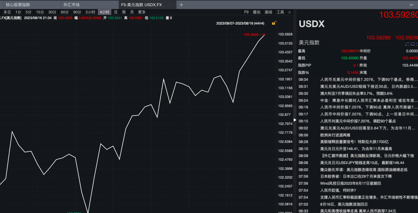 在紀要發(fā)布的當日,美股三大指數(shù)全線收跌。其中納指連續(xù)第三個交易日跌超1%,截至收盤,納指跌1.15%、道指跌0.52%、標普500指數(shù)跌0.76%。美元指數(shù)則繼續(xù)上行,在“103”關(guān)口上方不斷沖高,盤中最高觸達103.5991點。