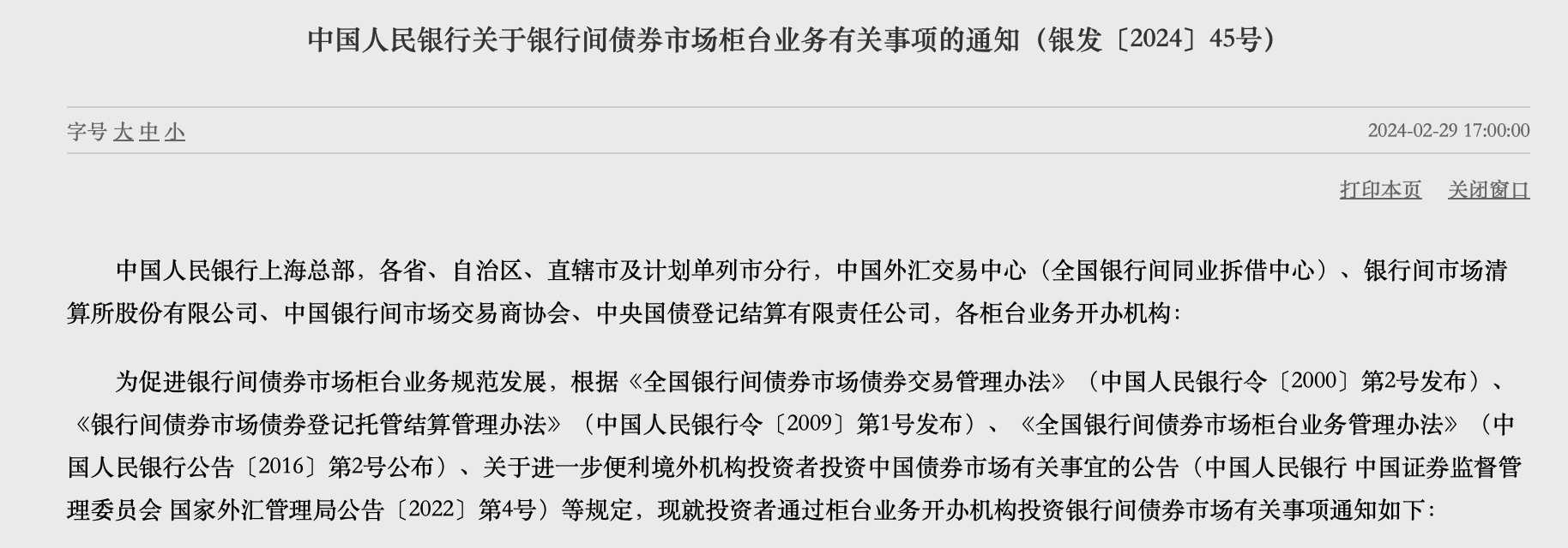 2月29日,中國(guó)人民銀行發(fā)布《關(guān)于銀行間債券市場(chǎng)柜臺(tái)業(yè)務(wù)有關(guān)事項(xiàng)的通知》(下稱《通知》),自2024年5月1日施行?!锻ㄖ访鞔_了柜臺(tái)投資者范圍和柜臺(tái)業(yè)務(wù)品種,對(duì)促進(jìn)債券市場(chǎng)高質(zhì)量發(fā)展具有重要意義。