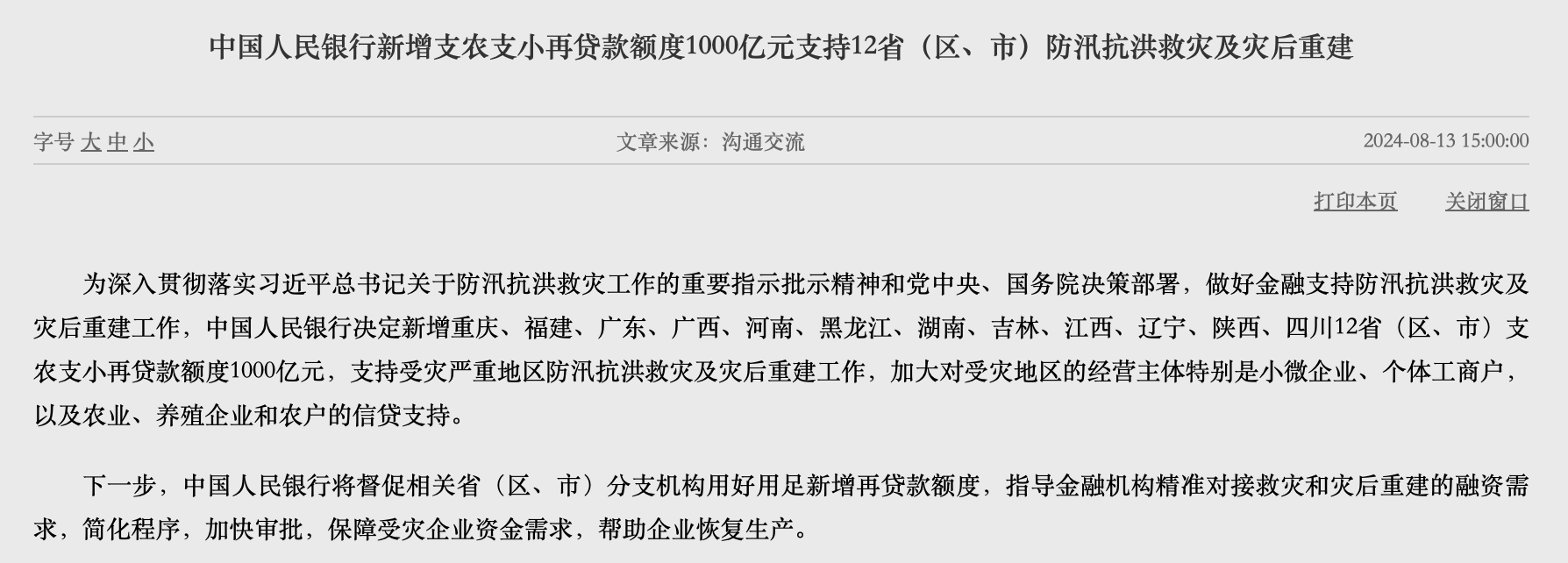 本報訊 (記者劉琪)8月13日,中國人民銀行發(fā)布消息,為深入貫徹落實習近平總書記關(guān)于防汛抗洪救災(zāi)工作的重要指示批示精神和黨中央、國務(wù)院決策部署,做好金融支持防汛抗洪救災(zāi)及災(zāi)后重建工作,中國人民銀行決定新增重慶、福建、廣東、廣西、河南、黑龍江、湖南、吉林、江西、遼寧、陜西、四川12省(區(qū)、市)支農(nóng)支小再貸款額度1000億元,支持受災(zāi)嚴重地區(qū)防汛抗洪救災(zāi)及災(zāi)后重建工作,加大對受災(zāi)地區(qū)的經(jīng)營主體特別是小微企業(yè)、個體工商戶,以及農(nóng)業(yè)、養(yǎng)殖企業(yè)和農(nóng)戶的信貸支持。
