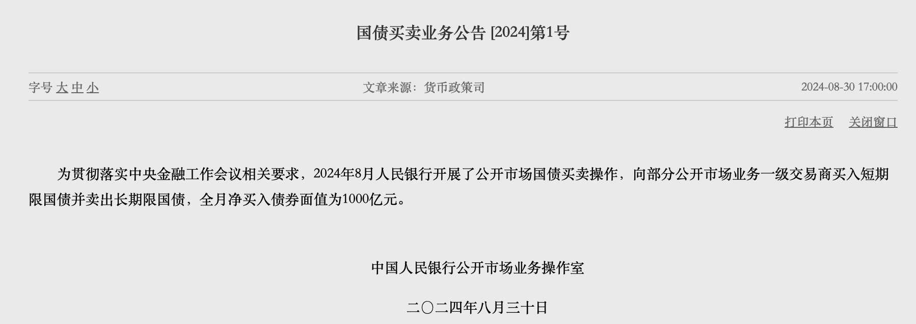 8月30日,中國人民銀行(下稱“央行”)在其網(wǎng)站新開設(shè)的“公開市場(chǎng)國債買賣業(yè)務(wù)公告”專欄中發(fā)布了首份公告——國債買賣業(yè)務(wù)公告[2024]第1號(hào)。