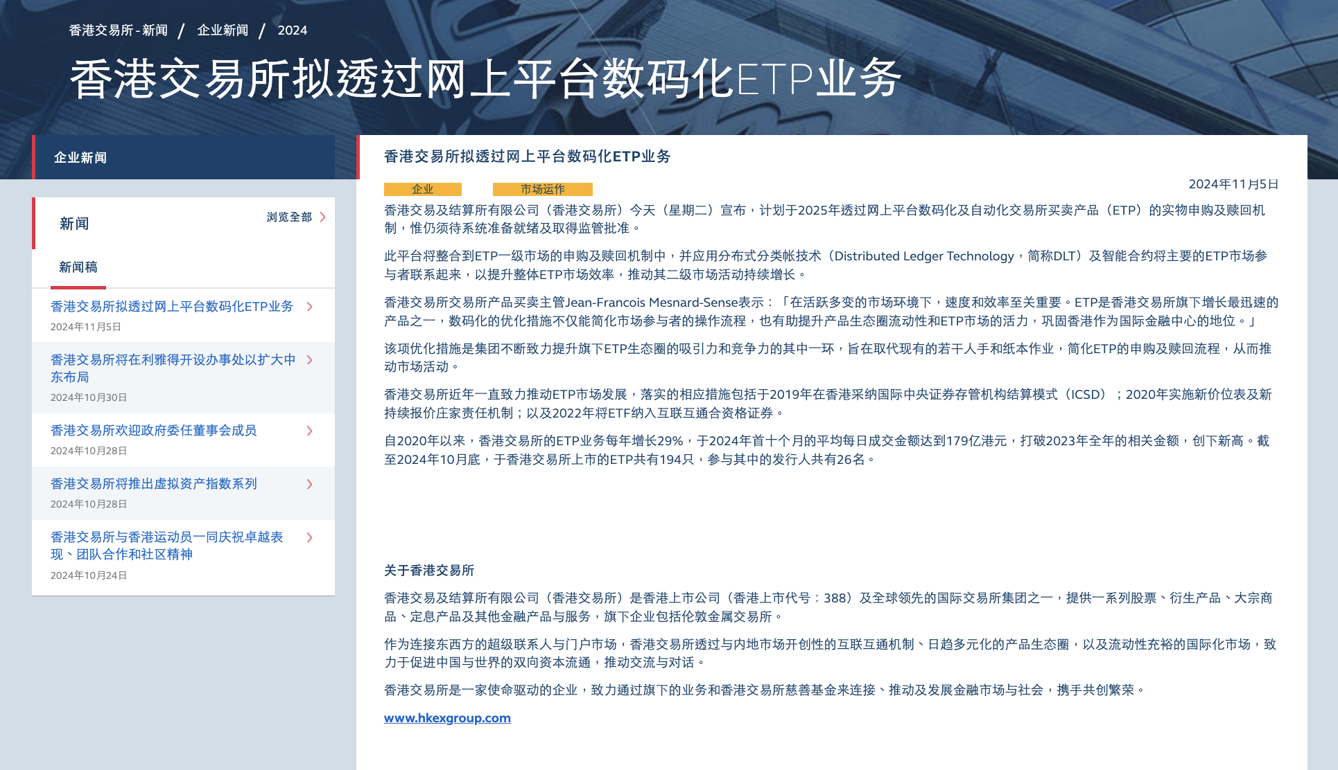 本報訊 (記者毛藝融)11月5日,香港交易及結算所有限公司(以下簡稱“香港交易所”)宣布,計劃于2025年透過網(wǎng)上平臺數(shù)碼化及自動化交易所買賣產(chǎn)品(以下簡稱“ETP”)的實物申購及贖回機制,仍需待系統(tǒng)準備就緒及取得監(jiān)管批準。
