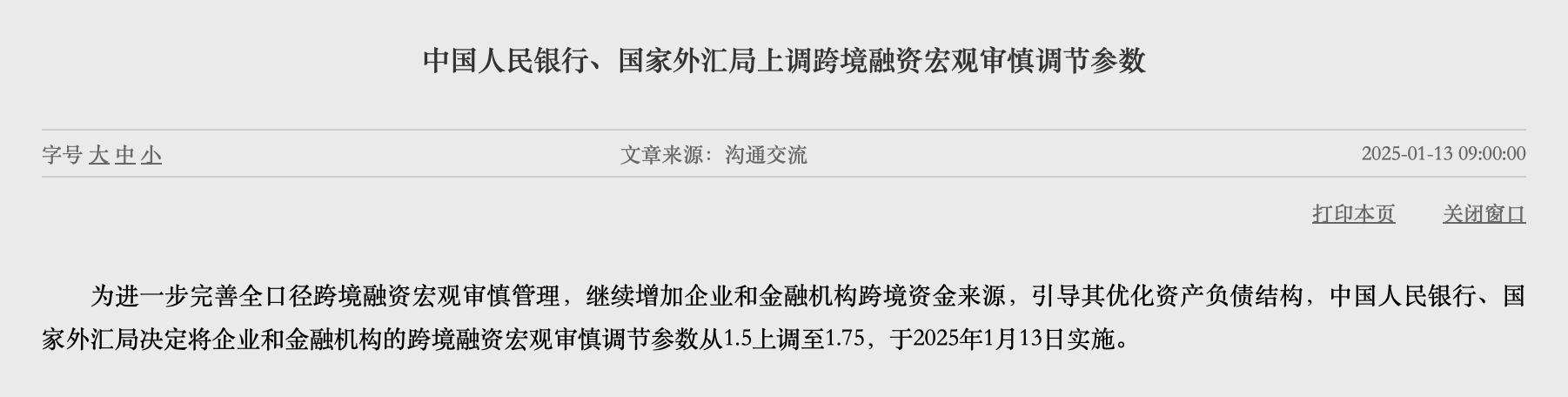 1月13日,中國人民銀行發(fā)布消息,為進(jìn)一步完善全口徑跨境融資宏觀審慎管理,繼續(xù)增加企業(yè)和金融機(jī)構(gòu)跨境資金來源,引導(dǎo)其優(yōu)化資產(chǎn)負(fù)債結(jié)構(gòu),中國人民銀行、國家外匯局決定將企業(yè)和金融機(jī)構(gòu)的跨境融資宏觀審慎調(diào)節(jié)參數(shù)從1.5上調(diào)至1.75,于2025年1月13日實(shí)施。