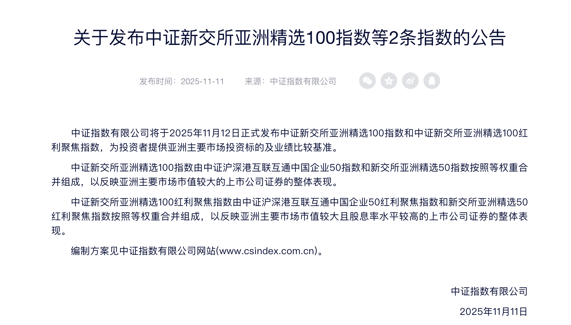 本報(bào)訊 (記者毛藝融)11月11日,中證指數(shù)有限公司在官網(wǎng)公告稱,將于2025年11月12日正式發(fā)布中證新交所亞洲精選100指數(shù)和中證新交所亞洲精選100紅利聚焦指數(shù),為投資者提供亞洲主要市場投資標(biāo)的及業(yè)績比較基準(zhǔn)。