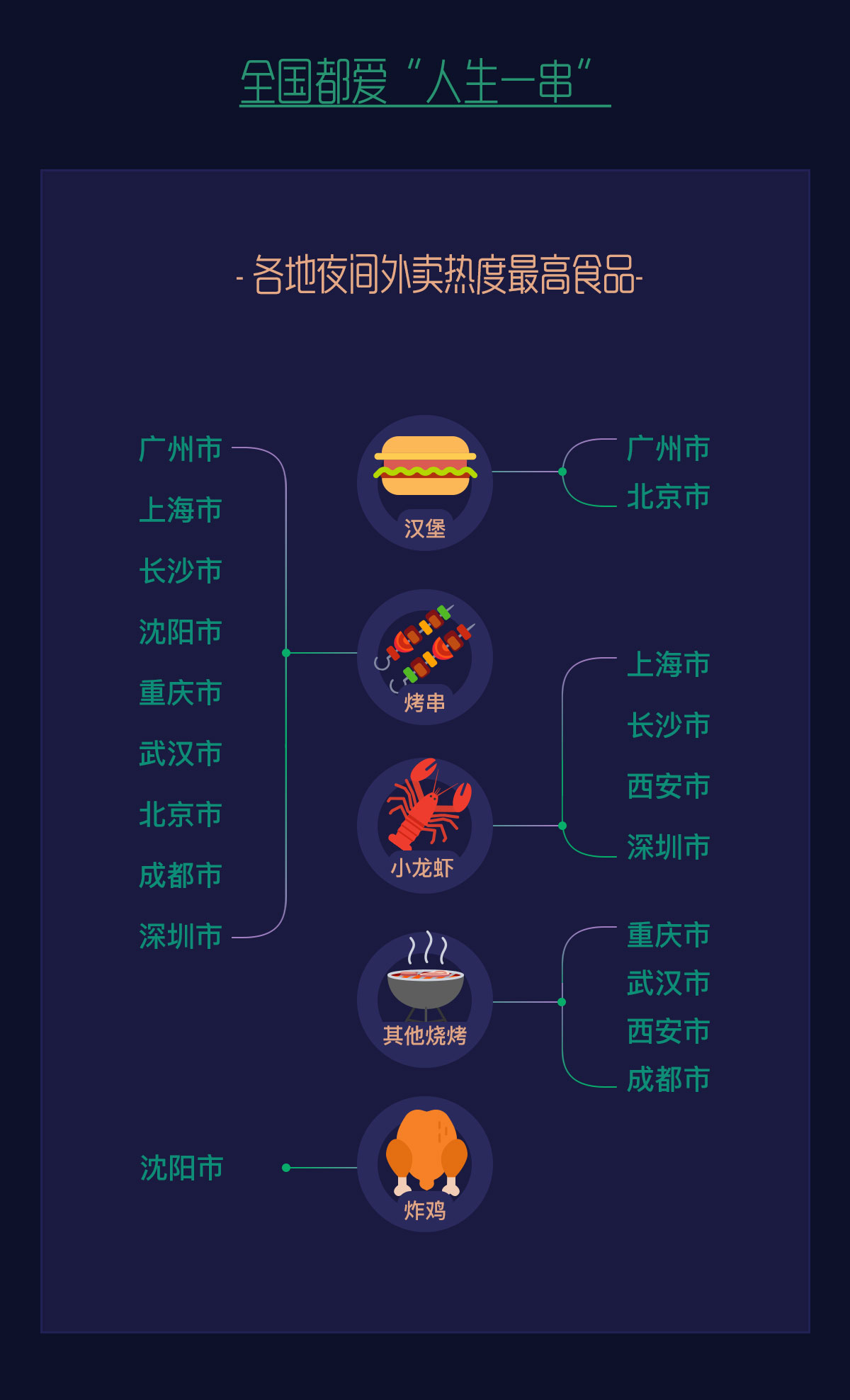 夜宵江湖戰(zhàn)況“激烈”,烤串成為多個城市美團(tuán)用戶最愛的夜間外賣。面包甜點(diǎn)、小龍蝦、火鍋、奶茶等其他宵夜品類也有明顯增長,折算成等價食物,約等于北京人民吃掉33萬串烤串,武漢人民吃掉22萬串烤串,上海人民吃了24萬只小龍蝦,“逛吃逛吃”成為夜晚首選。北京人民最愛三里屯,重慶人都去解放碑。