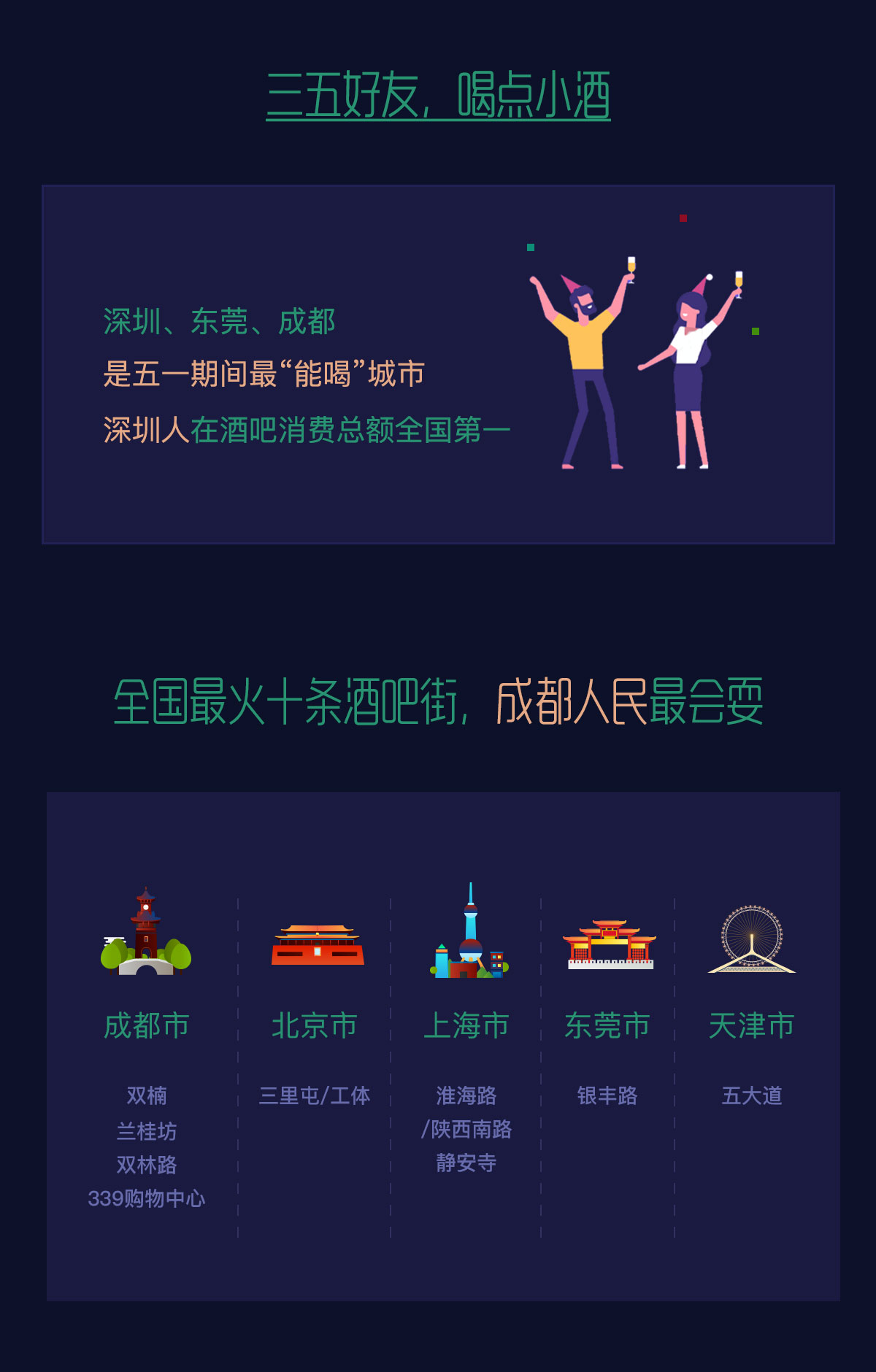 深圳、東莞、成都,是在五一期間最“能喝”的城市,深圳人在酒吧的消費(fèi)全國第一。根據(jù)美團(tuán)數(shù)據(jù),成都人民最愛耍,全國最火熱的10條酒吧街,成都占據(jù)4個名額,小酌兩杯成為假期夜間的熱門選擇。