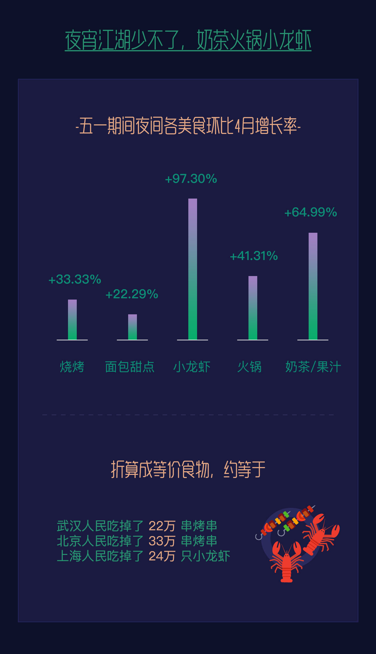 根據(jù)微信和美團(tuán)聯(lián)合發(fā)布《“五一”夜經(jīng)濟(jì)數(shù)據(jù)》,小長假期間,全國人民都在“報復(fù)性夜宵”。5月1日-3日晚上9點(diǎn)至次日凌晨2點(diǎn),全國微信支付餐飲線下支付金額環(huán)比增長447%,武漢人民夜宵支付金額環(huán)比增長270%,其中烏魯木齊增幅最大,對比3月環(huán)比增長16倍。