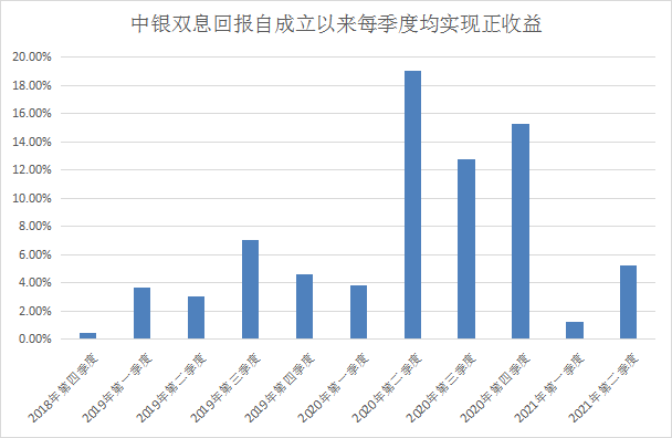 以他管理的中銀雙息回報(bào)為例,該基金在成立以來(lái)的11個(gè)自然季度中均取得正收益。(數(shù)據(jù)來(lái)源:基金定期報(bào)告,截至2021/6/30)