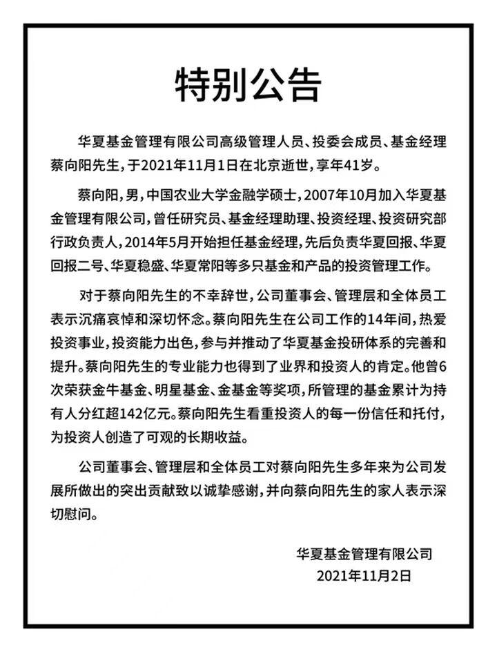 2021年11月2日下午,華夏基金發(fā)布特別公告,華夏基金管理有限公司高級(jí)管理人員、投委會(huì)成員、基金經(jīng)理蔡向陽(yáng)先生,于2021年11月1日在北京逝世,享年僅41歲。