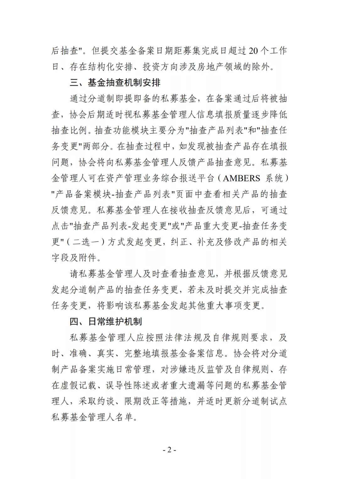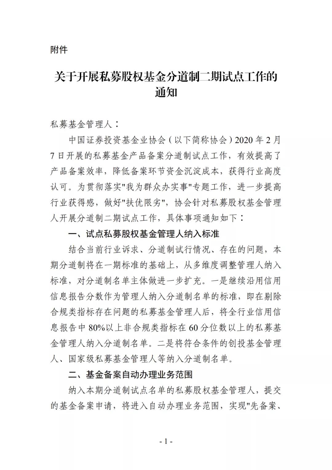 以下為中基協(xié)《關于開展私募股權基金分道制二期試點工作的通知》原文:
