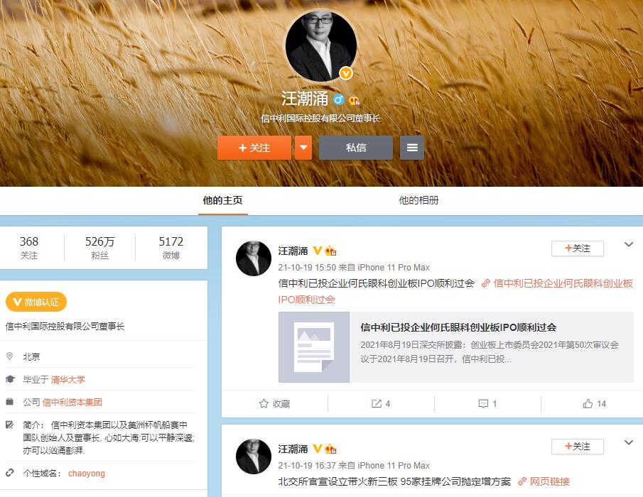 汪潮涌在新浪微博是坐擁526萬粉絲的大V,其最后一條微博更新于10月19日。