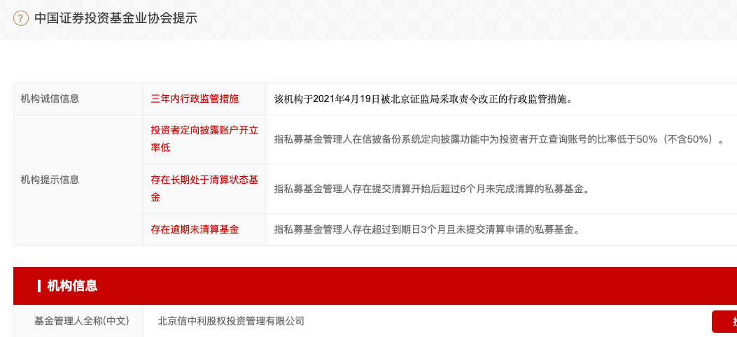 同時,中基協(xié)信息顯示,信中利存在長期處于清算狀態(tài)基金等問題。