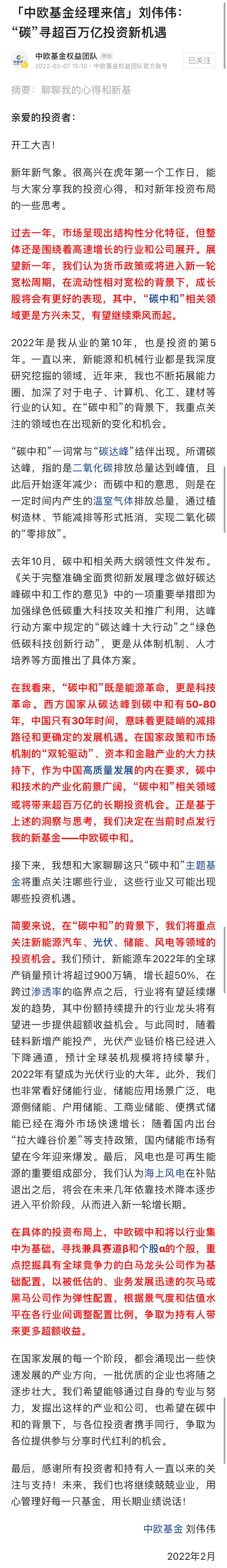 在致投資者的一封信中,劉偉偉提到,很高興在虎年第一個工作日,能與大家分享我的投資心得,和對新年投資布局的一些思考。展望2022年,在“碳中和”的背景下,我們將重點關注新能源汽車、光伏、儲能、風電等領域的投資機會。
