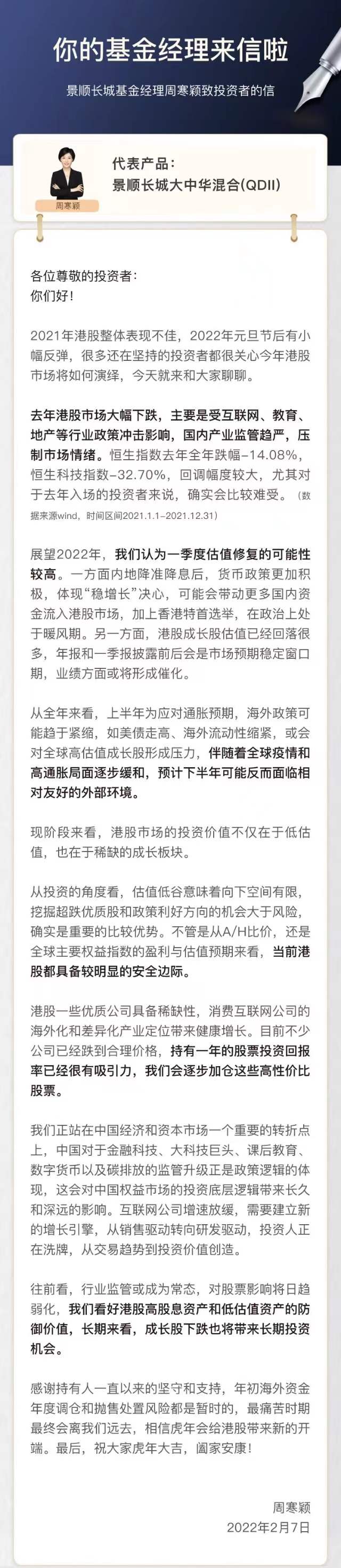 2月7日,景順長城大中華混合(QDII)基金經(jīng)理周寒穎在致投資者的信中著重提到了對港股投資機會的看法。