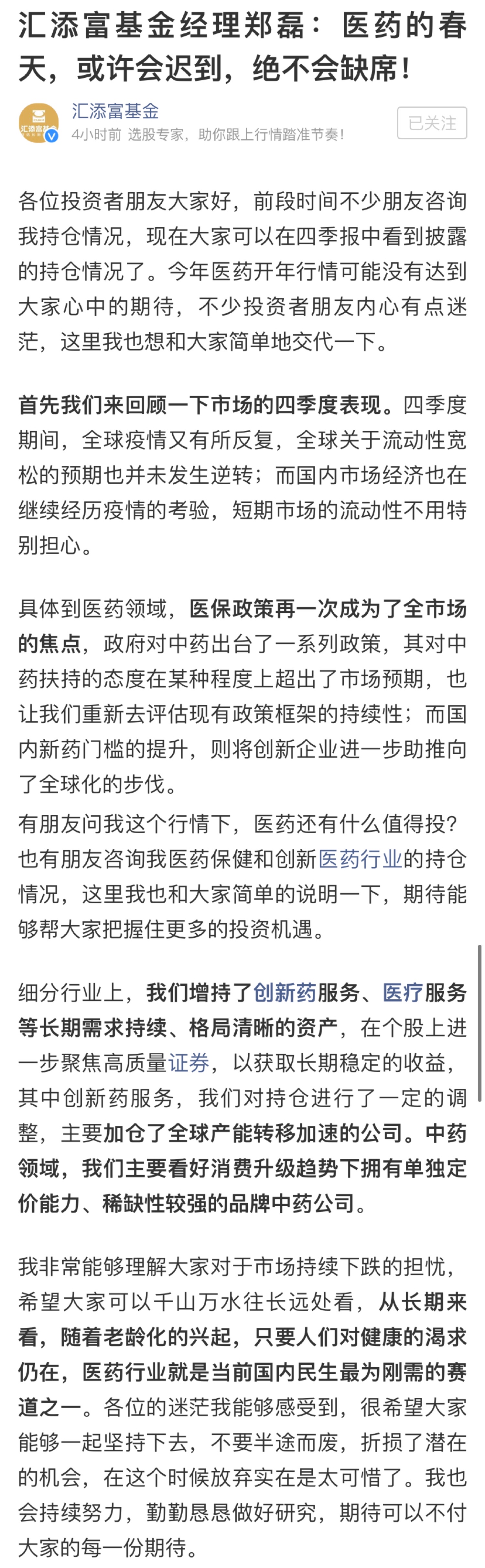 主攻醫(yī)藥賽道的鄭磊則對投資者坦言,”我非常能夠理解大家對于市場持續(xù)下跌的擔憂,希望大家可以千山萬水往長遠處看,從長期來看,隨著老齡化的興起,只要人們對健康的渴求仍在,醫(yī)藥行業(yè)就是當前國內民生最為剛需的賽道之一。各位的迷茫我能夠感受到,很希望大家能夠一起堅持下去,不要半途而廢,折損了潛在的機會,在這個時候放棄實在是太可惜了。我也會持續(xù)努力,勤勤懇懇做好研究,期待可以不付大家的每一份期待。“
