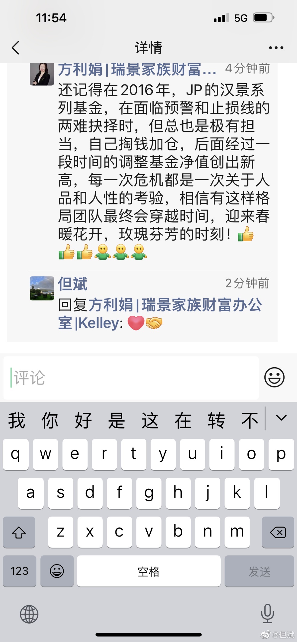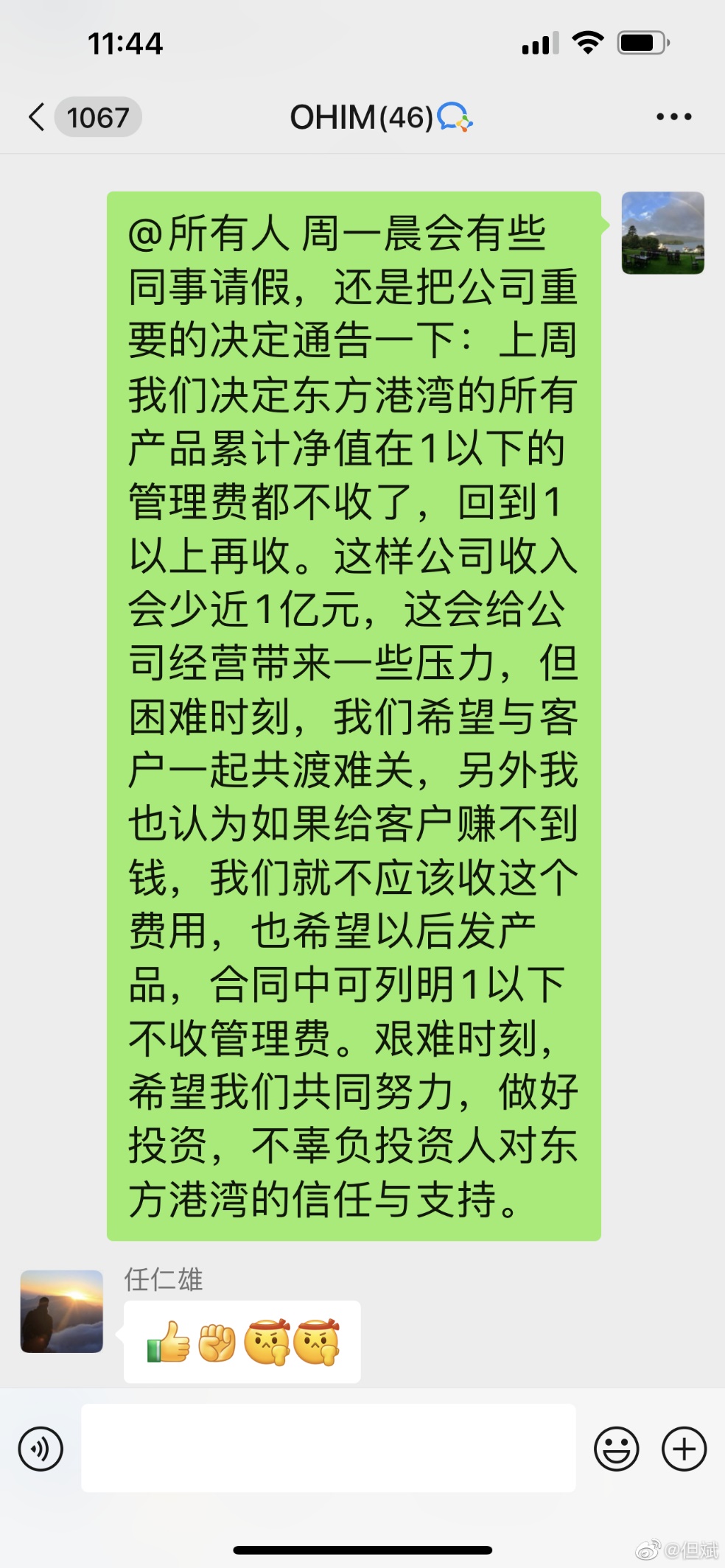 但斌還表示,“另外,我認(rèn)為如果客戶賺不到錢,我們就不應(yīng)該收這個(gè)費(fèi)用,也希望以后發(fā)產(chǎn)品,合同中可列明1以下不收管理費(fèi)。目前我們正在與各渠道溝通協(xié)調(diào),艱難時(shí)刻,希望我們共同努力,做好投資,不辜負(fù)投資人對東方港灣的信任與支持。”