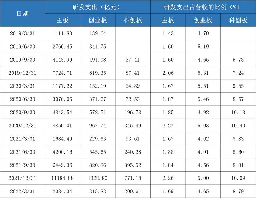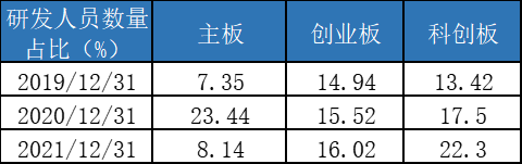 由于整體體量較小,從研發(fā)的絕對金額和人數(shù)上,科創(chuàng)板不如創(chuàng)業(yè)板和主板,但是從研發(fā)費用率和研發(fā)人員占比角度可以看到,科創(chuàng)板的“研發(fā)驅(qū)動”含量是目前所有板塊中最高的。